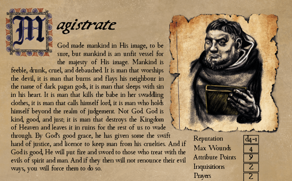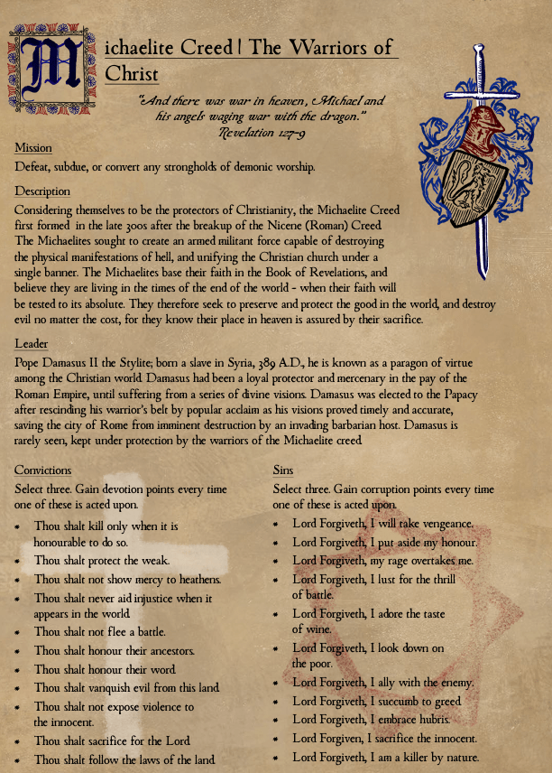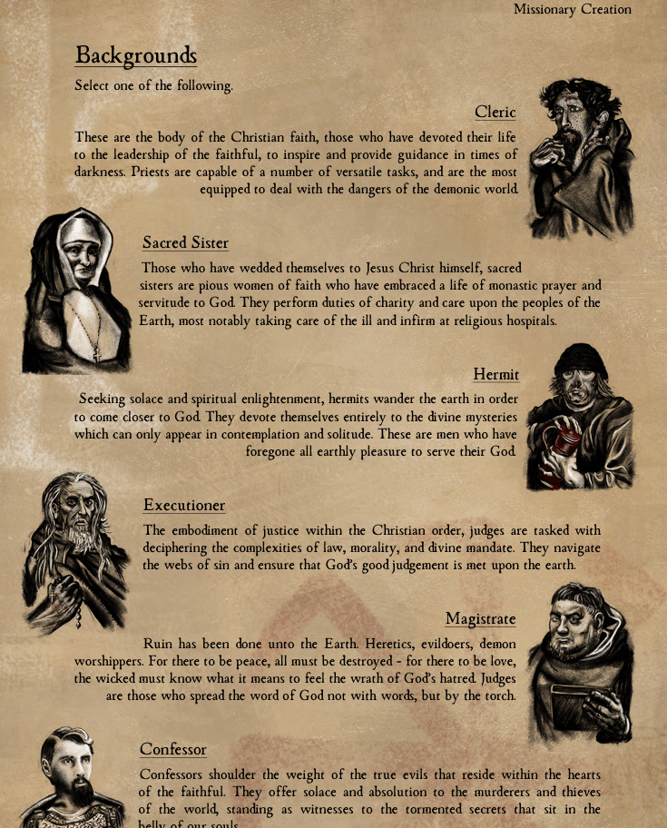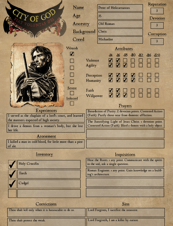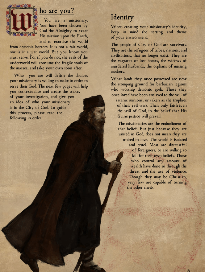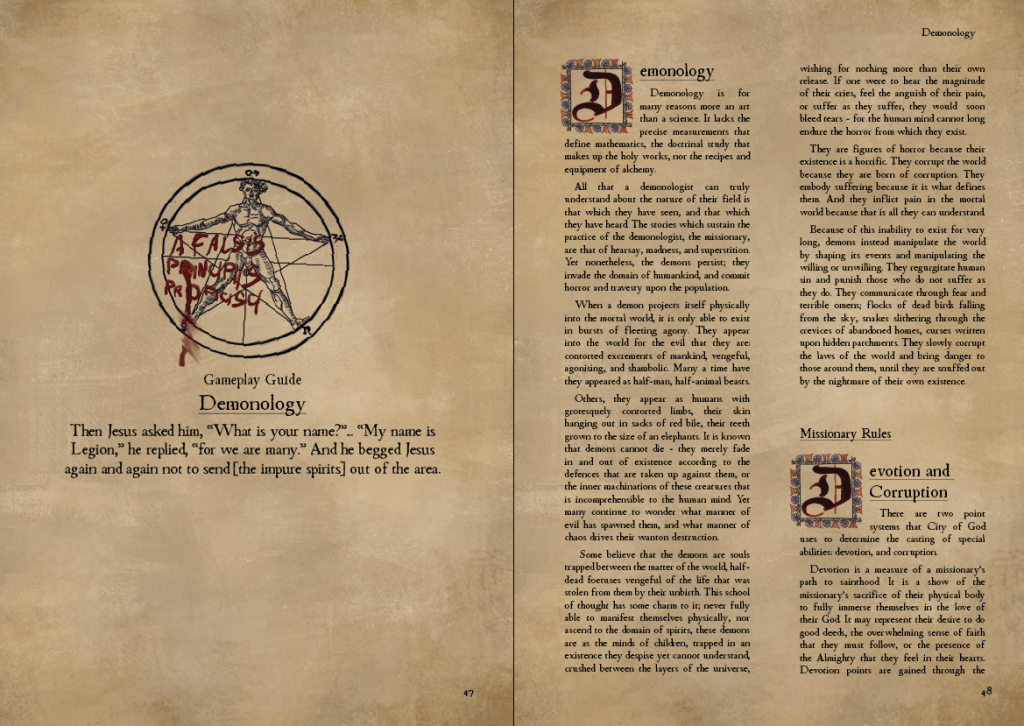 City of God is a demonic horror investigation TTRPG which places you in the role of an exorcist that is investigating demonic spirits in the world of the religious Dark Ages. You are powerless against these immortal beings, and powerless to the anarchy and violence of the world around you. Yet, it is your duty, enshrined by the Holy testaments of God, to banish these demons to their hellish domain, and restore God’s light upon the Earth.