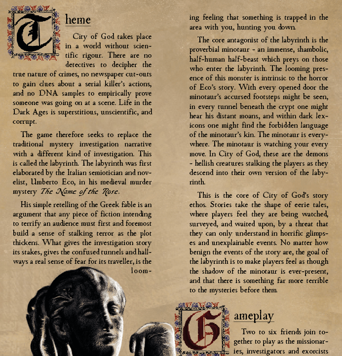 City of God, our flagship tabletop game, has released! Buy it at itch.io or drivethrurpg.com!