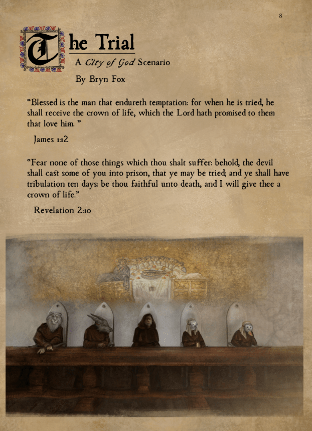 The purpose of the book is to allow Narrators to run two scenarios which, played together, form the beginnings of a City of God campaign. The first scenario, The Trial, introduces the Missionaries to the world of City of God, as they are kidnapped, tested and ultimately, initiated as elite agents of the early Christian Church, leading the fight against demonic entities and other supernatural evils..