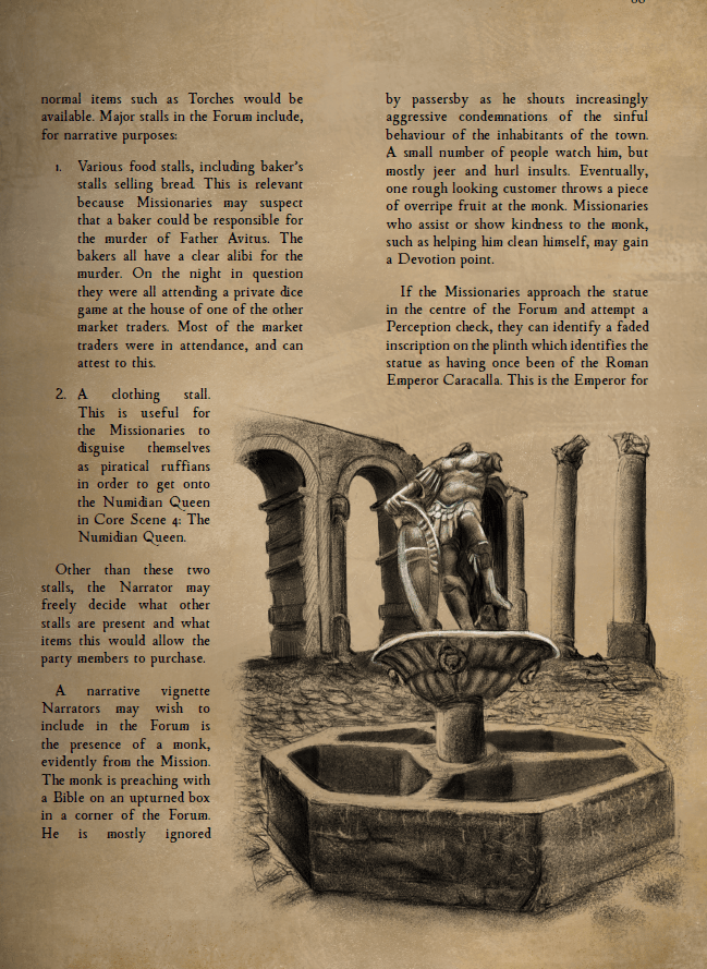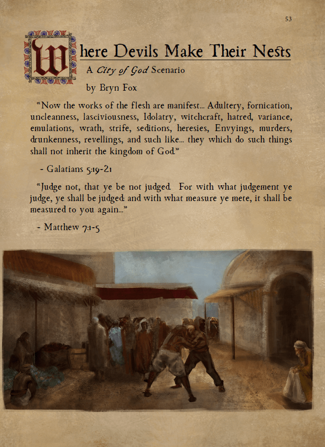 The second scenario, Where Devils Make Their Nests is a longer adventure for the Missionaries, wherein they hunt a demon through the streets of a crime-riddled port town in North Africa. Both scenarios are intended to be set in the late 5th century AD, shortly after the fall of the Western Roman Empire. Either scenario can also be played as a standalone.